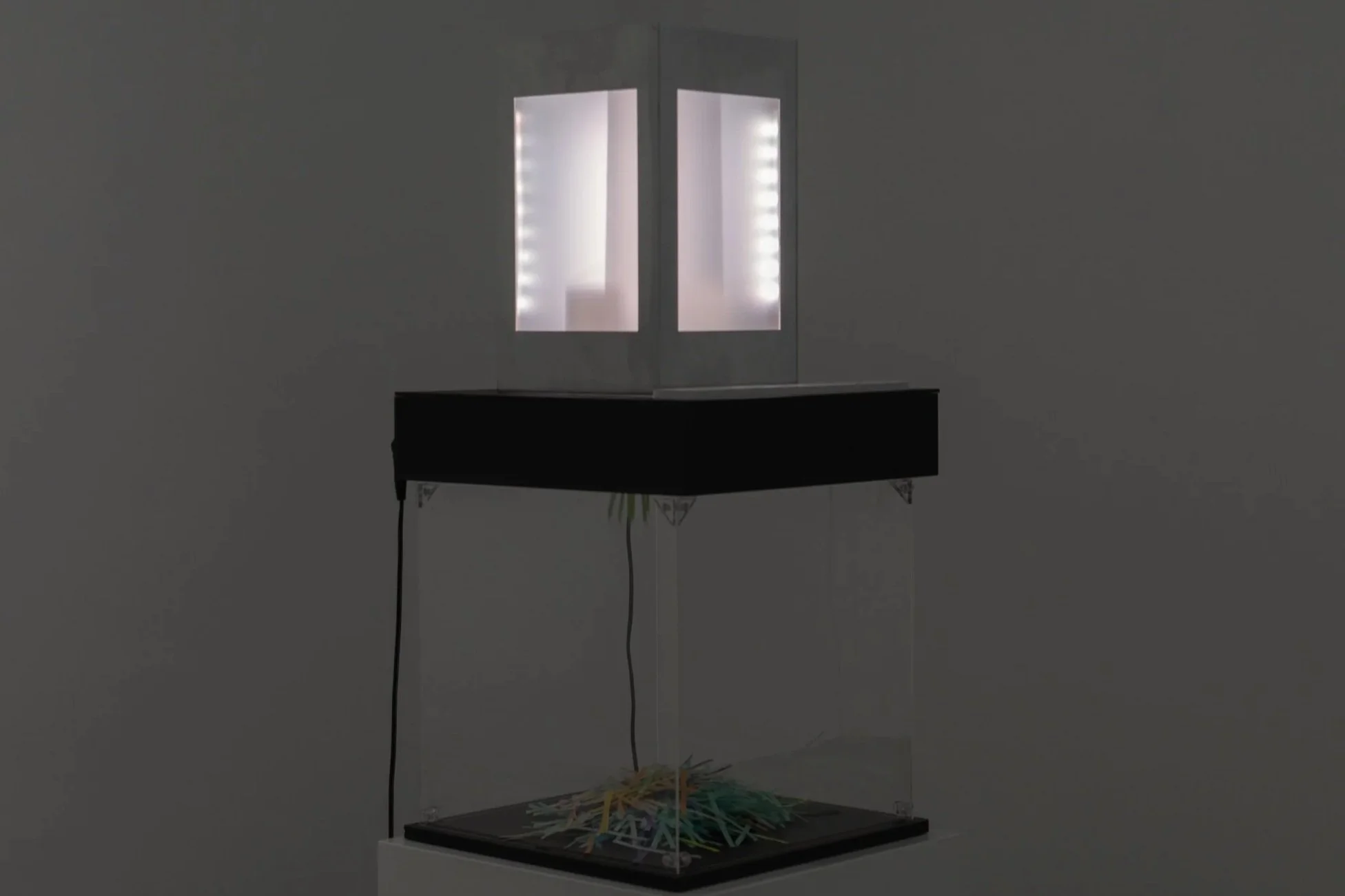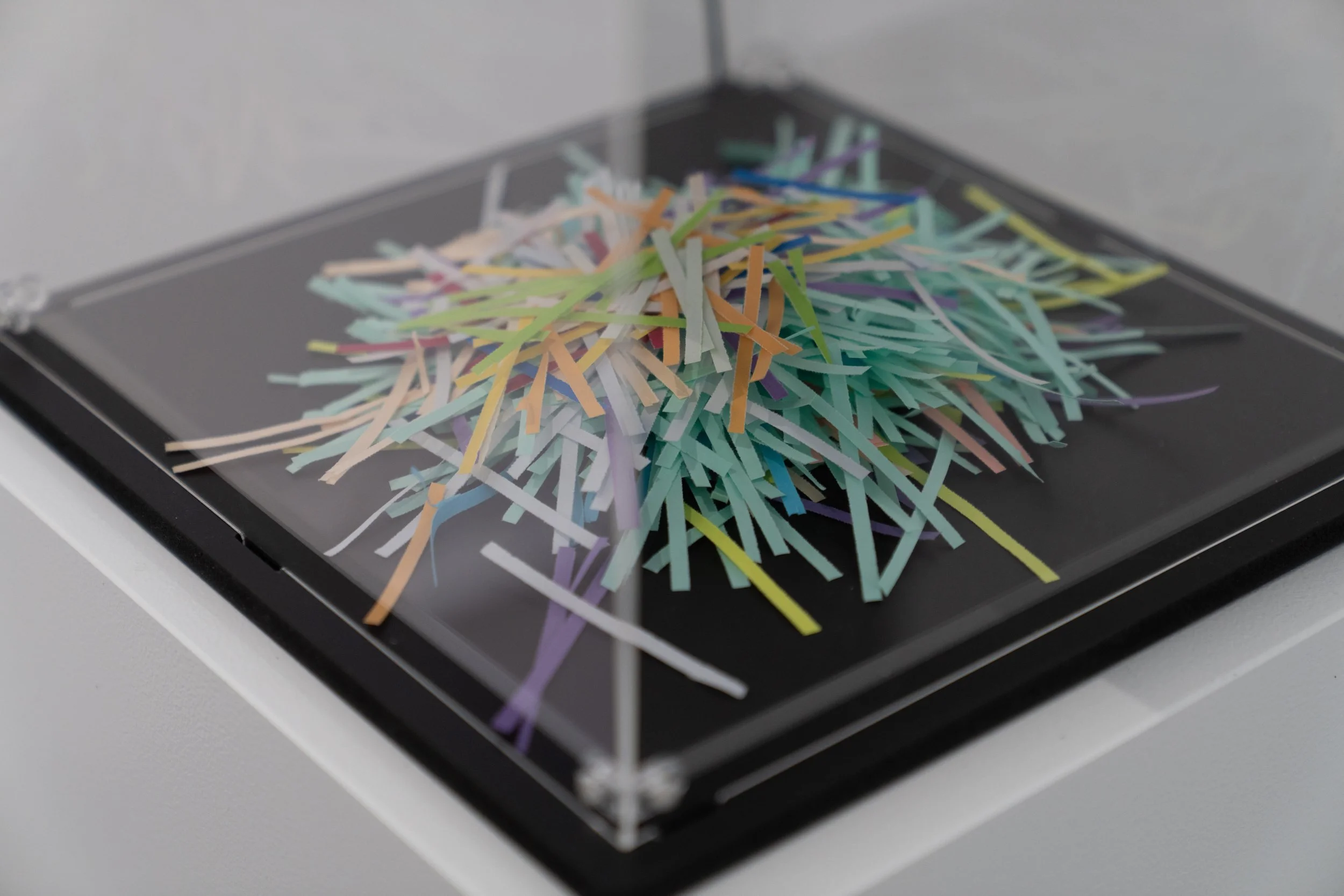 The shredded fragments collect inside an acrylic pedestal, softening and diffusing the internal light.